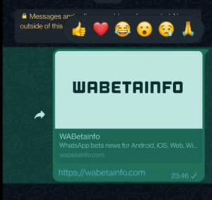 Denk hierbij aan reacties zoals je die ook kent van platformen Facebook en Instagram. Door het verstuurde bericht ingedrukt te houden, kan hierop gereageerd worden met een emoji. Hierbij kan gekozen worden uit een lachende emoji, een hartje, een verbaasde emoji, een duimpje, een emoji met een traantje of de biddende emoji.