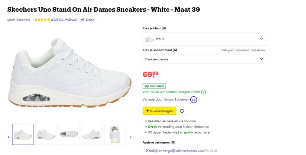 Als je iets verder onder de koopknop kijkt dan zie je staan dat er 11 andere verkopers zijn. Deze bieden allemaal exact dezelfde schoen aan, maar de verkoop via de koopknop gaat naar Nelson Schoenen. Hoewel de consument de mogelijkheid heeft om andere aanbieders te bekijken, koopt meer dan 90% van de mensen op Bol.com bij de aanbieder die de ‘koopknop wint’.
