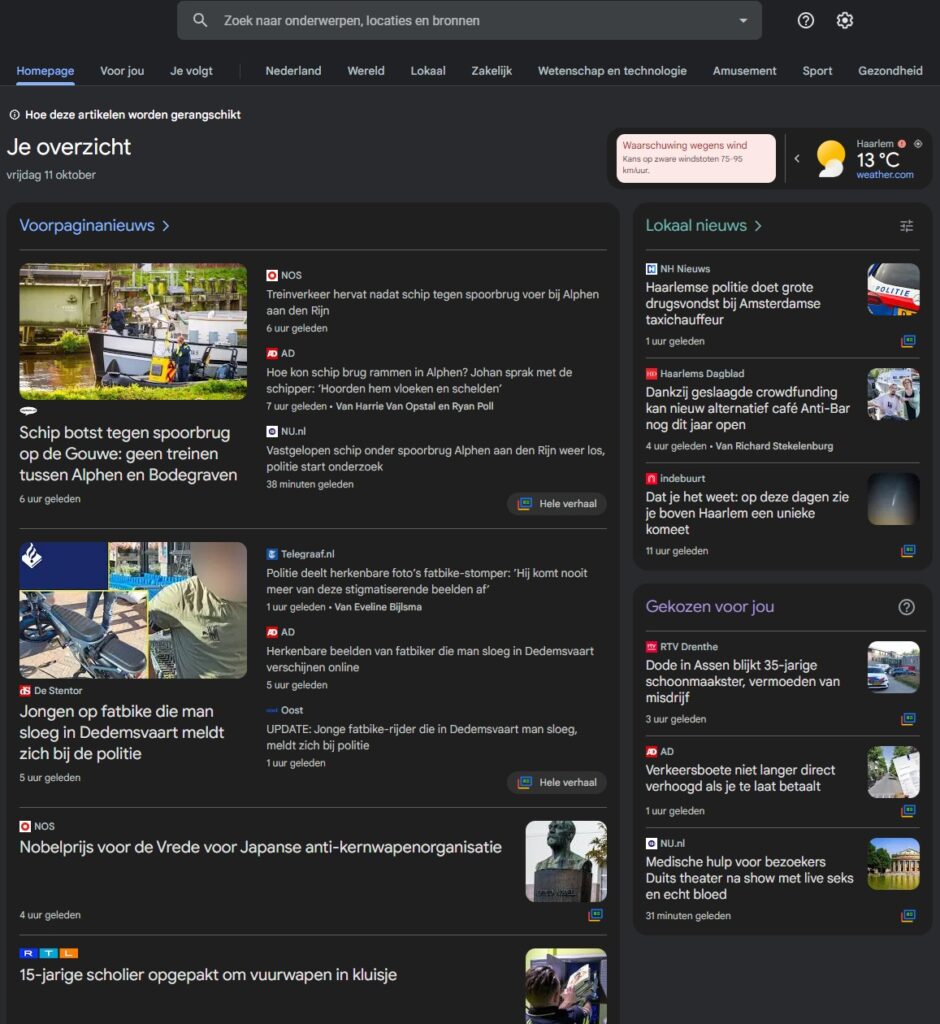 - Lokaal nieuws: gebaseerd op de locatie waarvandaan gezocht wordt