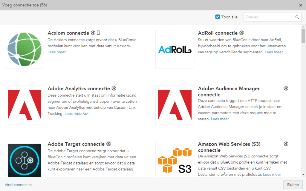 Nu het script is geplaatst en je toegang hebt tot jouw eigen BlueConic omgeving, kun je beginnen met het koppelen van alle kanalen. Met de optie connecties kun je verbindingen maken waarmee data wordt uitgewisseld tussen BlueConic (jouw centrale systeem) en diverse andere platformen. Ter info: het leggen van connecties met bijvoorbeeld Facebook of Google Ads is in deze fase niet per se noodzakelijk en kan je ook altijd op een later moment nog oppakken.