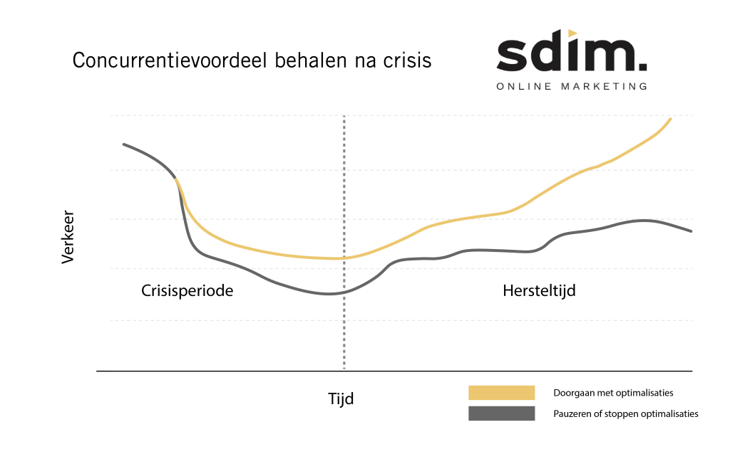 Wanneer de optimalisatie- en ontwikkelwerkzaamheden worden doorgezet, overtreft een bedrijf het herstel van de markt. Verbetering van zoekwoordposities zorgt hier voor een groot concurrentievoordeel. De onderste lijn geeft aan wat er gebeurt als deze werkzaamheden worden stilgelegd. Het herstel duurt veel langer en terugkomen op het oude niveau is zeer onwaarschijnlijk.