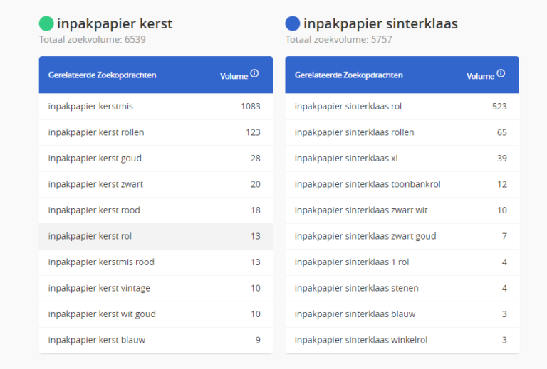 Weergave van zoektermen en zoekvolume ‘inpakpapier sinterklaas’ en ‘inpakpapier kerst’